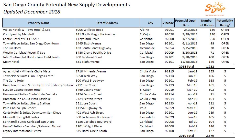 By the end of 2018, a total of eight properties opened (or re-opened) in San Diego County, adding 1,252 hotel rooms to the supply. Several properties that were scheduled to open during this last year have been delayed into 2019, which currently lists fourteen hotels to open. 2019 poses to add another 2,379 rooms to the supply if all the hotels listed open as anticipated.