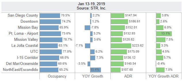 San Diego hotels improved in the third week of 2019 with occupancy rates ranging from almost 61% in Del Mar/Oceanside to near 79% in Mission Valley. The largest year-over-year growth for this week was in Escondido with a 15% increase, followed by properties in the I-15 Corridor with a 7% improvement. Average daily rates also increased, ranging from $108 in Escondido to $224 in La Jolla. All regions (except for Del Mar/Oceanside) experienced significant growth in ADR over the same period last year. Properties in Pt. Loma/Airport region increased the most at 13%, followed by Mission Valley at almost 8% growth.