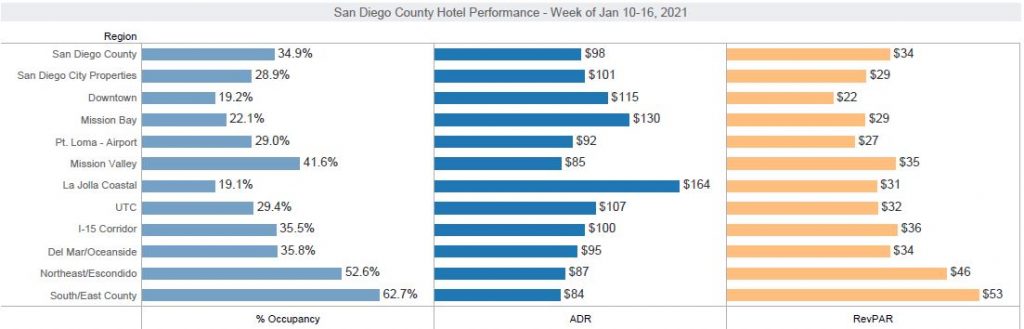 - County occupancy was 34.9% for the week, ranking San Diego 16th among top markets and 4th in the western competitive set (behind Phoenix 50.6%, Los Angeles 41.9%, and Seattle 38.8%).