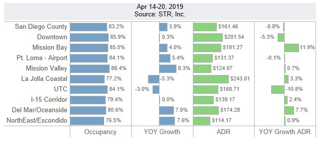 The third week of April 2019 saw hotel occupancy rates in most San Diego regions improve upon 2018 numbers for the first time in several weeks. Occupancy rates ranged from 76.5 percent in Escondido to 88.4 percent in Mission Valley, with all but two regions increasing year over year. The regions with the most growth were Mission Valley with 8.3 percent growth, followed by Escondido with 7.6 percent growth over 2018. Average daily rates ranged from $114 in Escondido to $243 in La Jolla. Growth in ADR was mixed across the regions, but those with the greatest growth were hotels in Mission Bay at 11.9 percent, followed by Del Mar/Oceanside properties with 7.7 percent growth.